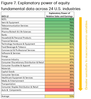 Figure 6 shows the 24 industries classified under Global Industry Classification Standard and the direction and size of each variable in explaining the dependent variable. Perhaps unsurprisingly, relative sales and earnings per share account are two major contributors to explaining subsector’s relative performance, with large variation across industries. These two equity fundamental variables could explain more than 50% of the subsector’s relative performance for 13 out of the 24 industries, which also means that macroeconomic variables account for more than 50% explanatory power for 11 out of the 24 industries (Figure 7).