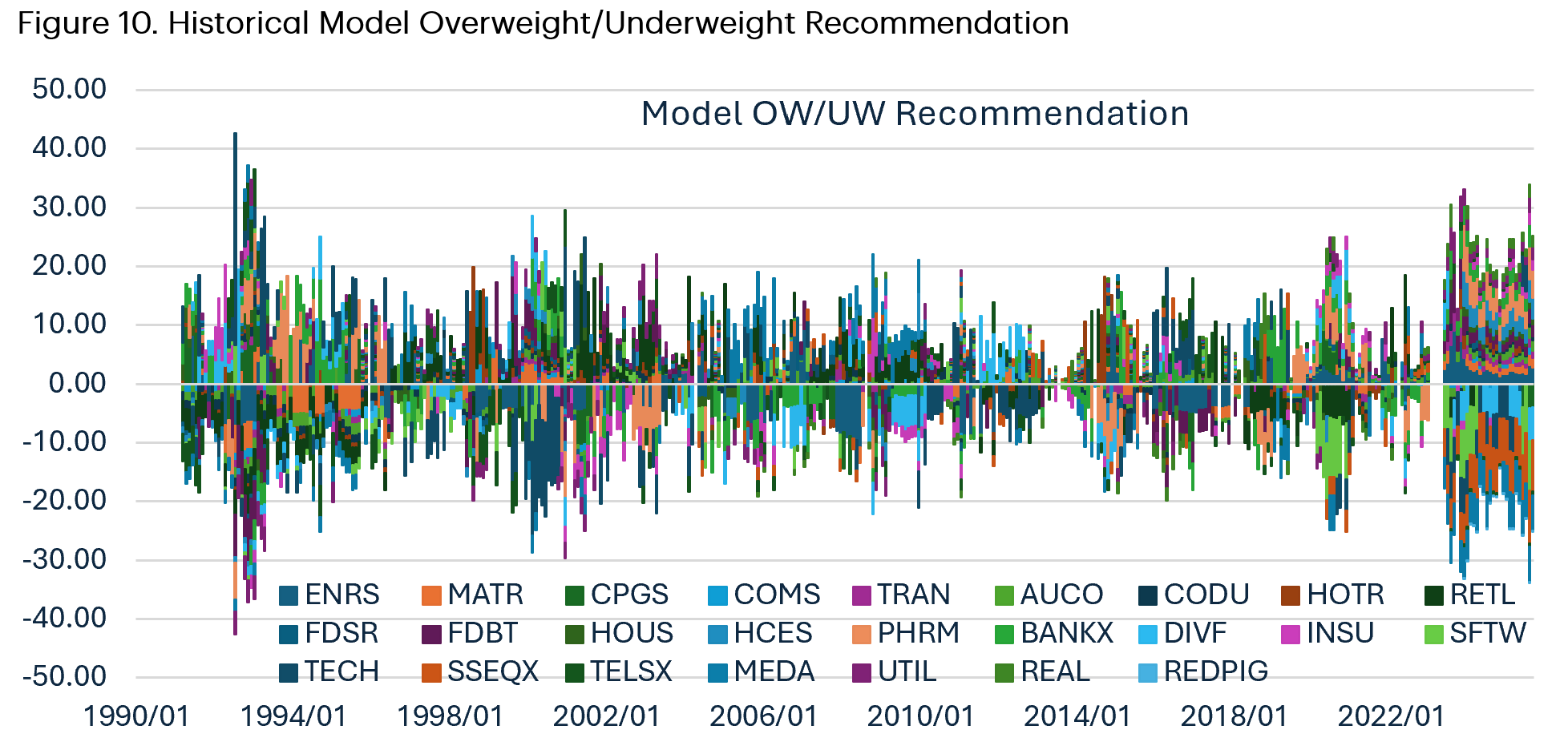 For each of the 24 subsectors, we derived a fair value estimate of where the subsector should trade relative to the benchmark, as shown in Figure 9. This fair value estimate will become the backbone of the Quantitative Subsector Rotation Strategy (QSRS). For backtest purpose, we use 12% deviation from fair value as the threshold for overweighting and underweighting the subsector. This process is repeated at the end of every month, resulting in a dynamic OW/UW recommendation shown in Figure 10.