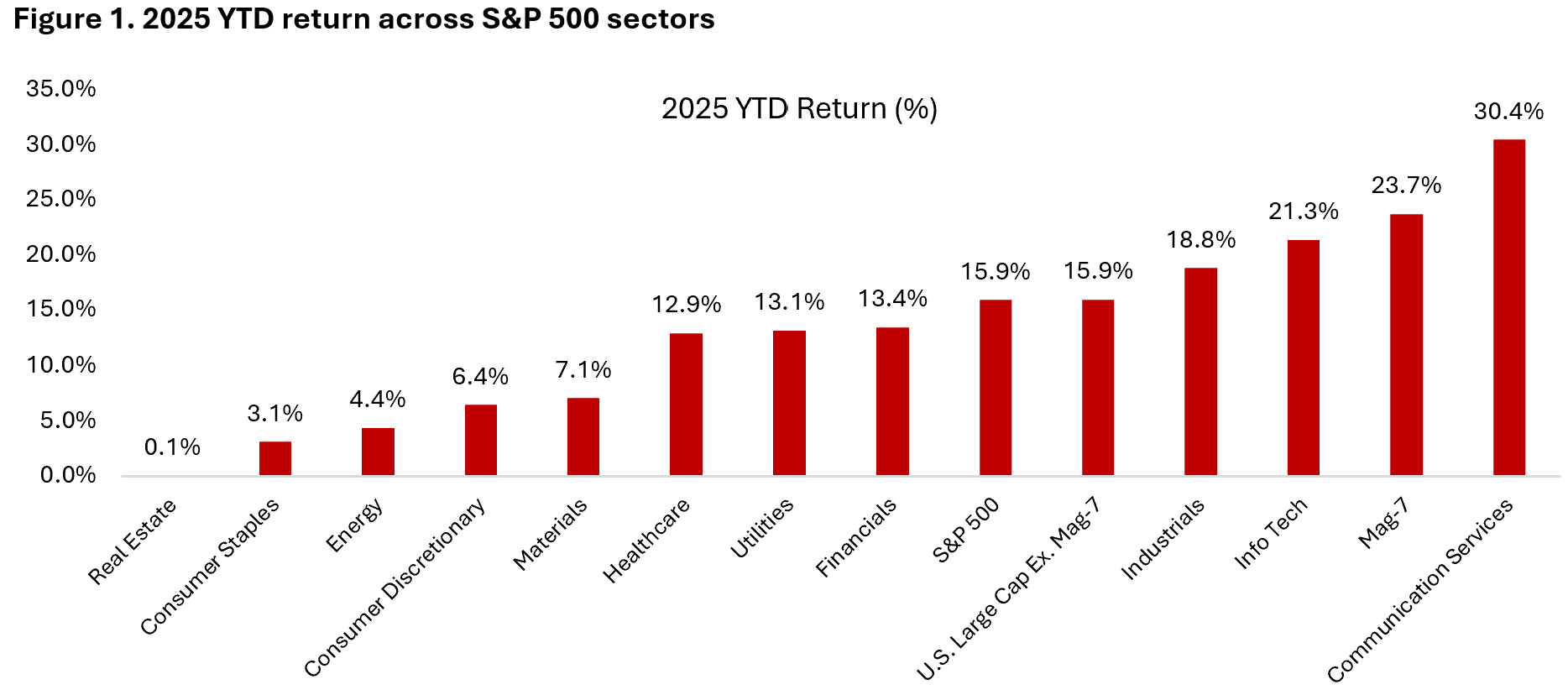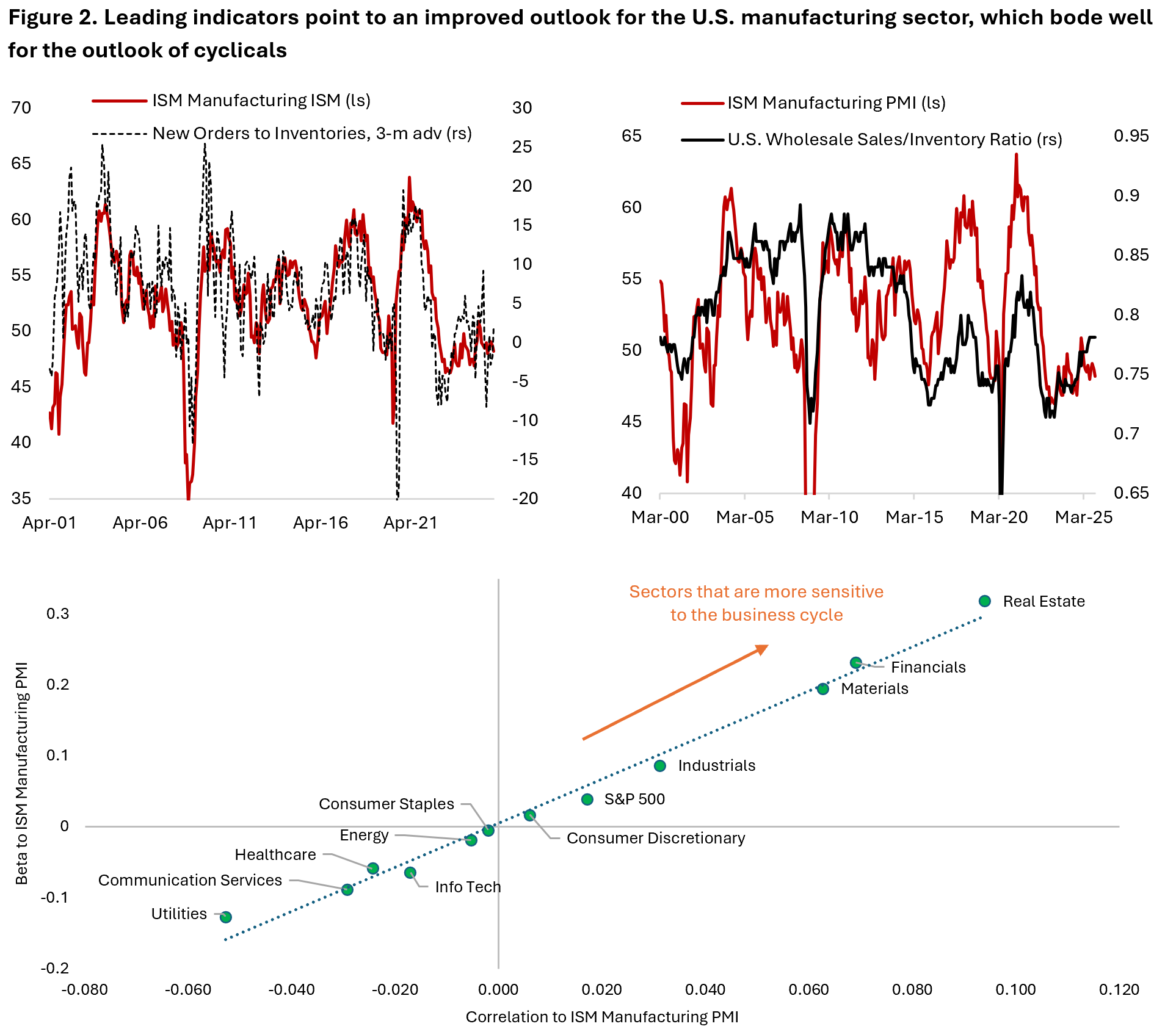 Within the industrial sector, there are evidences that the boom in AI capex spending has overshadowed the weaknesses of many other cyclical industries, whose outlook is now starting to improve. Auto, housing, manufacturing, lending by regional banks, and other select segments of industrials have all been weak in recent years, as highlighted by the ISM Manufacturing PMI hovering below 50 for most part of the past three years (Figure 2). Improving outlook for cyclical sector activity should translate to broadening of U.S. equities’ return driver and benefit the stock price of industries that have significantly lagged the broader equity benchmark since 2023.