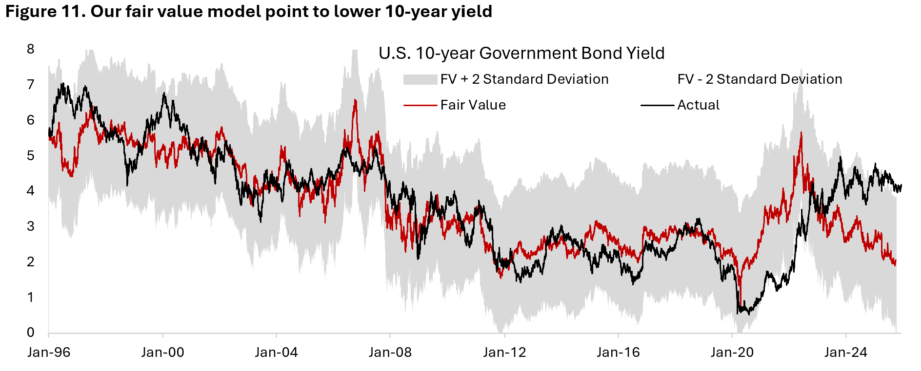 One of our most heated internal debates is on the outlook for long-term bonds. On one hand, an upswing in the U.S. business cycle and fiscal sustainability concern are two factors should push yields higher. However, we are also cognizant that term premium has increased significantly in the past three years – to above 1% currently – and these factors may already be reflected in the current yield level. Our fair value model for U.S. 10-year yield, which indicates yield undershot significantly between 2020 and 2022, now think it has overshot materially (Figure 11). With inflation making decent progress over the past three years and the risk to the U.S. labour market tilted to the downside, the risk/reward for bonds is improving compared to in 2021-2023 period.