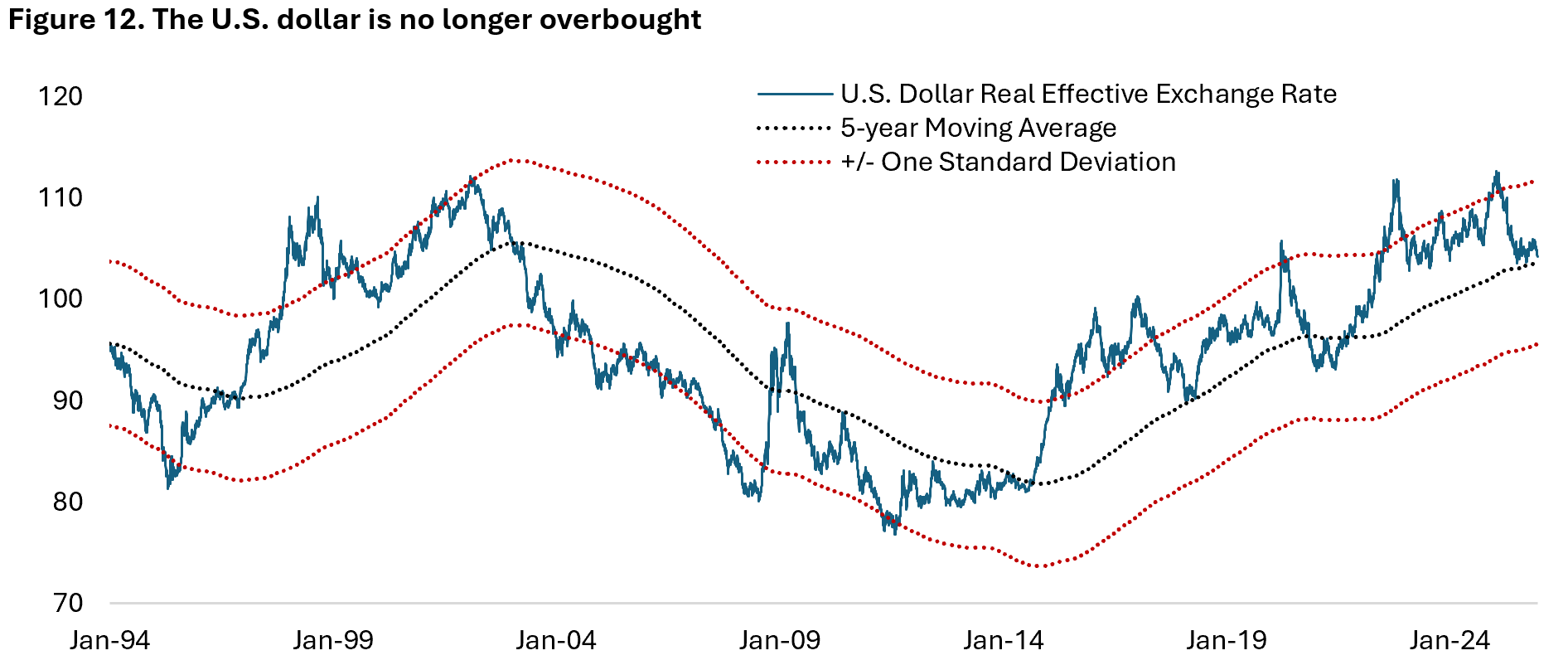 Lastly, on the U.S. dollar. For the last few months, we have become less bearish on the outlook for the greenback as it has fallen quite a bit on a real effective basis and is now close to prior 5-year moving average (Figure 12). If we are correct that European business cycle is also inflecting higher and that the continent’s growth outlook will also improve in 2026, the U.S. dollar could resume its slide but likely in a more gradual pace relative to the rapid depreciation we saw in 2025. Note that the ECB is likely already at the end of its monetary easing cycle, whereas the Federal Reserve is still expected to cut several more times this year.