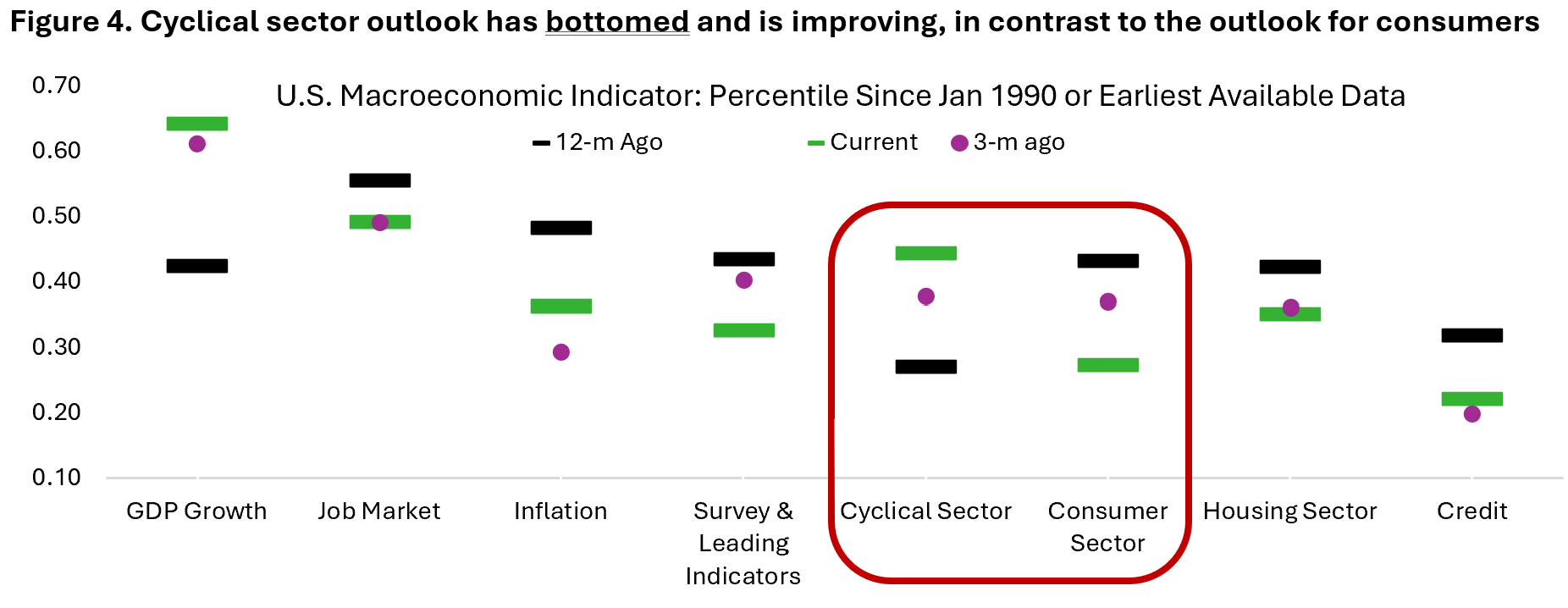 One of our main convictions in 2026 is that the outlook for U.S. consumers will remain downbeat while those of cyclical sectors should improve – essentially continuation of the trend we see over the past year (Figure 4). We expect downside risk for the U.S. economy primarily coming out of the job market and expect inflation to become less of a concern for policymakers and investors. Essentially, the path is open for a disinflationary, jobless economic boom in 2026. This potentially support the performance of long-term bonds, especially if fiscal sustainability concern is diminishing and cause the term premium to fall.