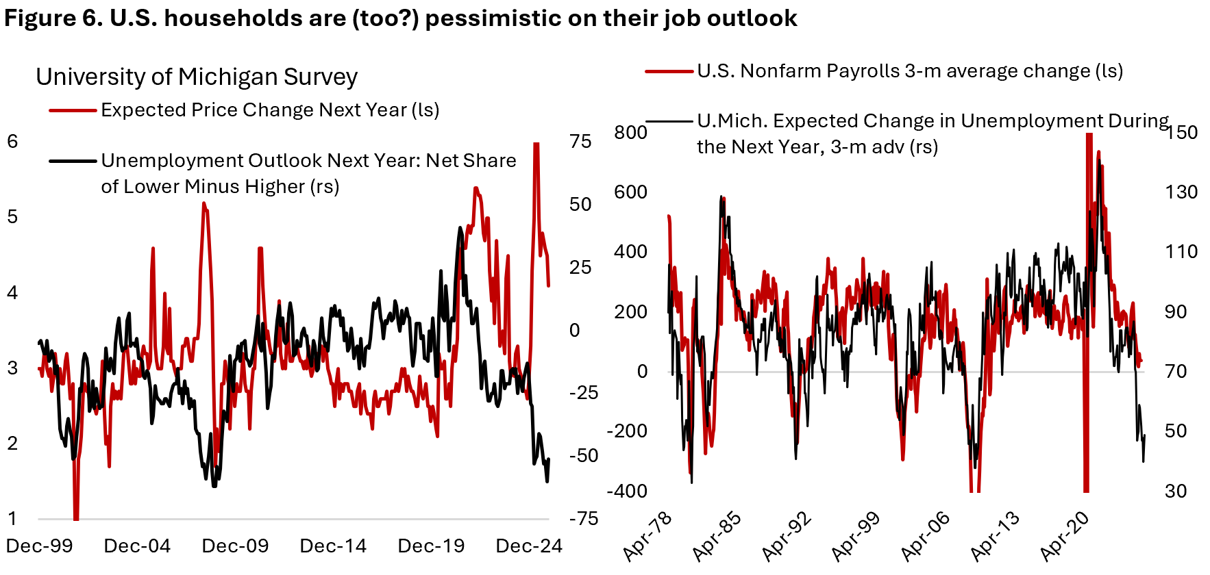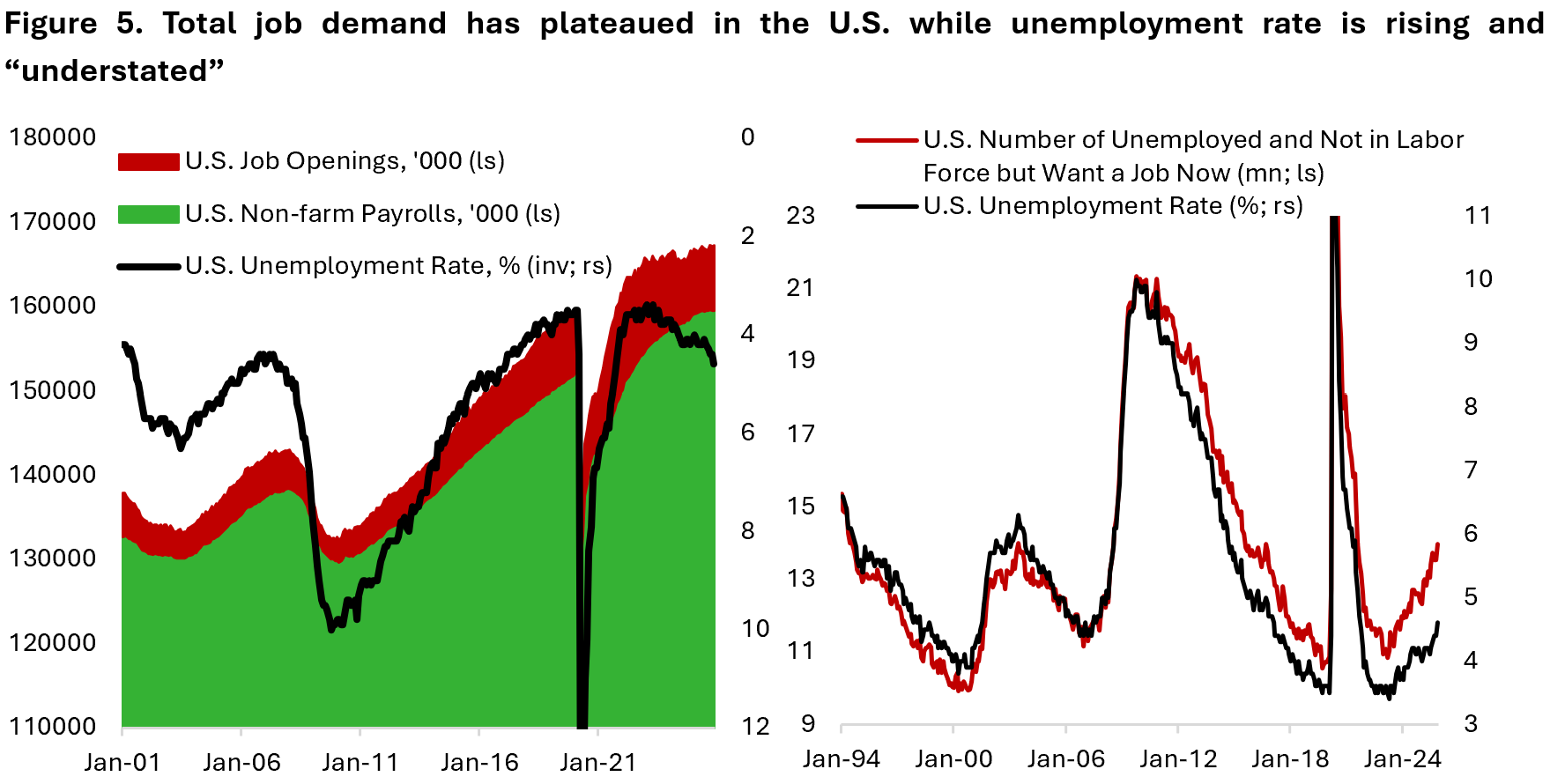 - Consumers are correctly worried about the job market. The hard data shows that total job demand has plateaued, unemployment rate is rising, and both quit rate and wage growth have declined to below trend, and workers said it is becoming increasingly difficult to get a new job. If we include people not in the labour force but want a job, unemployment rate could already be close to 6% rather than the officially reported 4.6% (Figure 5). This is in-line with the underemployment (U-6) measure rising to 8.7% in November, a cycle-high last seen in 2017.