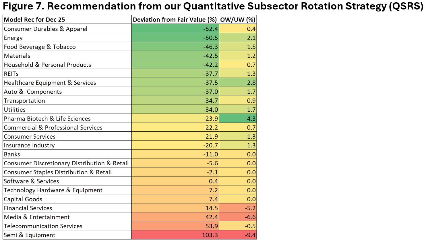 - Policy uncertainty likely has peaked, but USMCA negotiation could set for a bumpy road in the first half of the year. We believe that mid-term election in November will limit President Trump’s impulse to go aggressive in the negotiation process as affordability issues could at least be partially tied to the rising trade barriers. This could bode well for the auto industries and beaten-down transportation stocks, which ranked favourably by our proprietary Quantitative Subsector Rotation Strategy (QSRS) model (Figure 7). For instance, UPS stock price has fallen 50% from the peak amid declining revenue amid macro headwinds and deliberate pullback on less profitable segment of the business (Amazon). The stock is now trading at only 14x forward earnings, the low end of the past 10-year range and below the 17 times historical average. Over the past two years, UPS’ management has focused on what is under their control – cost – and implemented saving initiatives that will provide meaningful operating leverage once top-line growth turns positive again. In addition, the industry is a major beneficiary of AI application to sort packages and manage brokerage fees and changing customers’ tariffs charges – capabilities that both UPS and FedEx demonstrated during April’s chaotic tariffs debacle.
