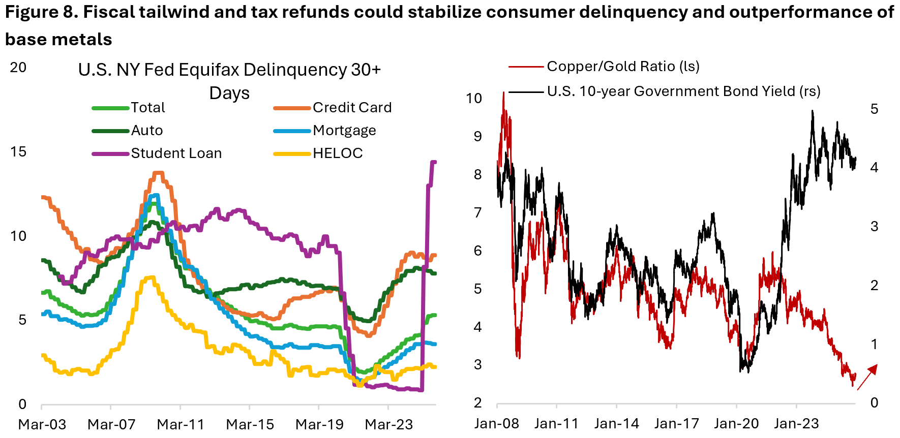 - Fiscal impulse is turning from headwind to a tailwind in 2026, estimated to boost growth between 0.5%-0.9% of GDP as OBBBA and the depreciation tax benefit should encourage business investments and reshoring. Front-loaded stimulus from retroactive personal income tax cuts means U.S. households are expected to receive roughly $80 billion in refunds in Q1 2026. This should stabilize consumer credit delinquency rates (Figure 8a) and potentially boost consumers’ spending power – improving the sentiment for retailers. For instance, Lululemon is now trading at only 16x forward earnings, half of its historical average level, on a forward earnings growth expectation of -11.8% y/y. We think this is a low bar and reflect extreme pessimism on the company’s outlook. As the outlook for U.S. and rest-of-world improve this year, our preference for commodities exposure shift from long precious metals to industrial metals (Figure 8b).