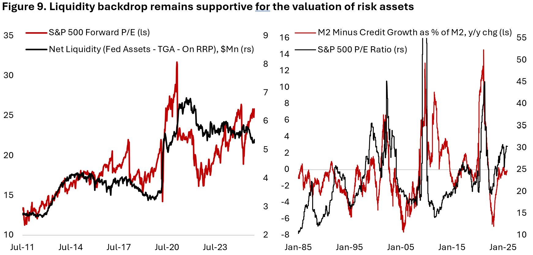 - Lagged impact of monetary easing is still in the pipeline alongside easing lending standards, which are supportive for rate-sensitive sectors. The Federal Reserve did de facto policy pivot from Quantitative Tightening (QT) to Quantitative Easing (QE) in December 2025 to maintain ample reserve balance, essentially boosting liquidity in the financial system. An improved outlook for U.S. economy and business cycle, alongside easy financial conditions, is a backdrop that historically has been supportive for equity valuation (Figure 9) and the performance of cyclicals such as transportations, materials, and U.S. regional banks. On the latter, for example, U.S. Bancorp is now trading at 11.9x forward earnings and is expected to grow earnings by 8% in the coming year, while giving dividend of 3.9% – higher than most in the sector. Even as U.S. financials have rallied in 2024 and 2025, regional banks have significantly lagged and may be due for a catch up.