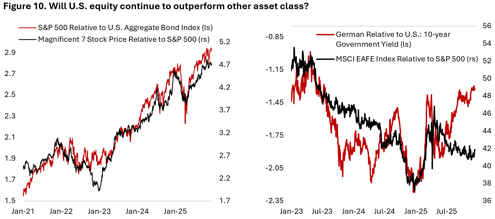 Taking a step back to asset allocation level, we believe there is high likelihood that equities will continue to outperform bonds in coming quarters, but expect the driver of equity performance to come increasingly from the laggards rather than continuation of rally among mega-cap tech stocks. In short, we think the trend that has been upheld since 2021 in Figure 10 will diverge for all the reasons we outlined in the previous section.