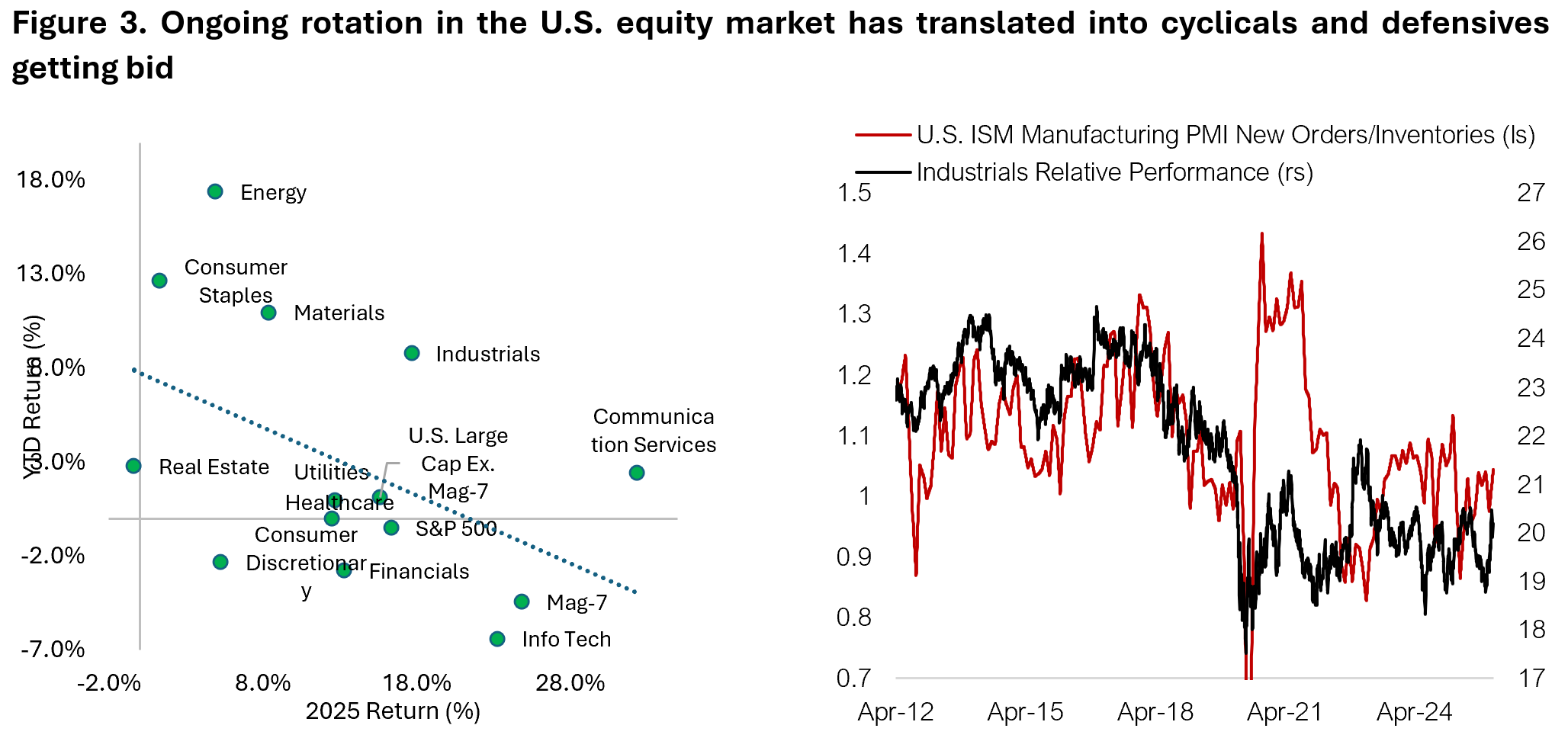 Underneath the surface, however, we saw healthy rotation in the U.S. equity market from growth into parts of cyclicals and defensives, which have delivered strong returns so far this year (Figure 3). For two quarters now we have talked about the potential for acceleration in cyclical activity in the U.S. and globally. That is now playing out with old-economy industrial and material sector outperforming the benchmark and January’s ISM manufacturing PMI showing sharp pickup in new orders. Within equities, we continue to diversify exposure towards cyclical industries that could benefit from upswing in the business cycle.