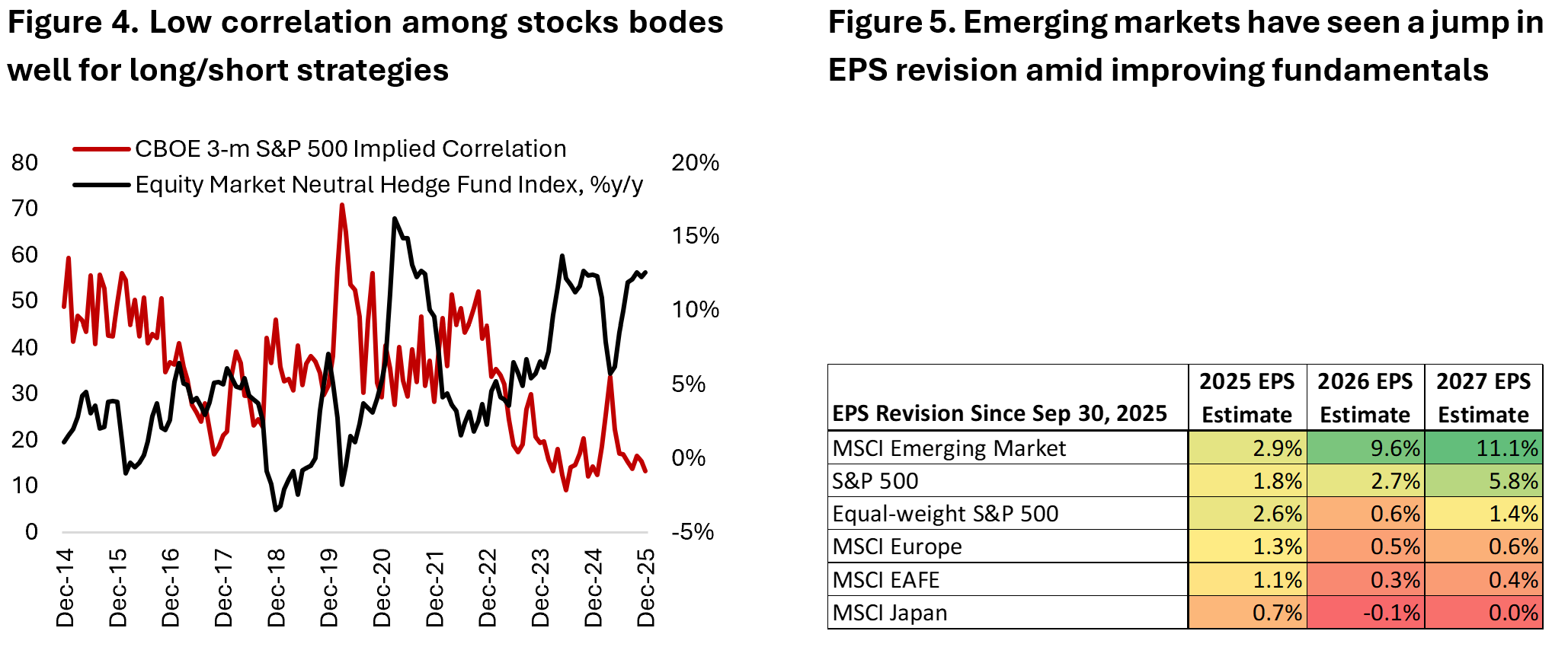 Amidst the backdrop of elevated concentration risk and expensive equity market, investors would also do well diversifying into hedge fund exposure that offers low correlation to public equity and fixed income. Rising dispersion in the equity market, which is the case today, tends to bode well for the return of long/short equity managers and other relative value strategies (Figure 4).